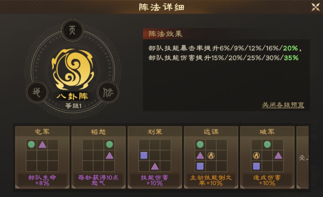 八卦阵能同时提供技能暴击与伤害加成,均为部队最核心的增益需求,能优化暴击流派的容错与基础伤害,布阵增益带来的续航与输出加成也很适配。