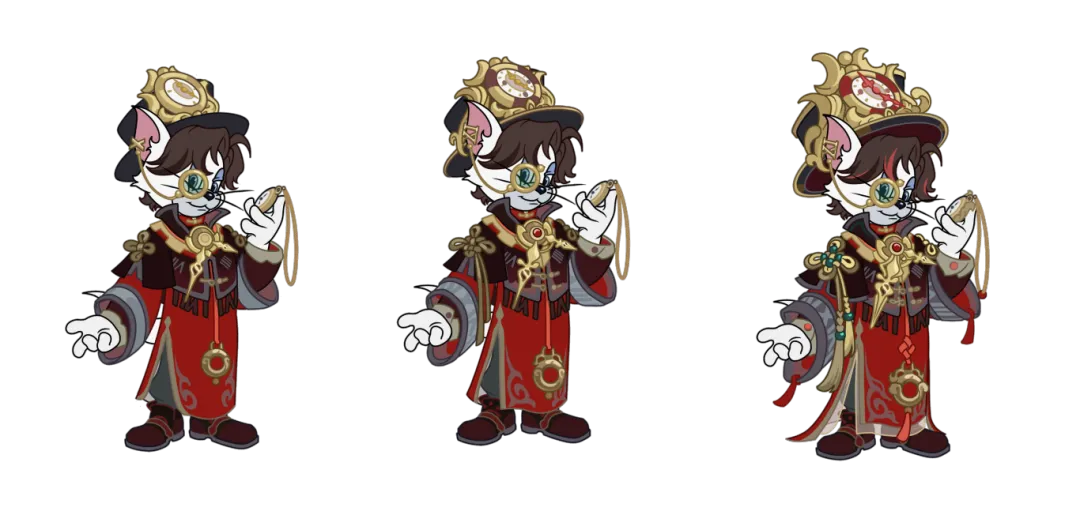 整体皮肤以金色与深红为主,金属质感的指针与钟表装饰是库博身份的体现,更是他对于时间感知的具象化。作为匠人,传统的技艺在他手中重新回到大街小巷;作为师父,徒弟们一代代的传承昭示着民俗再次焕发全新的光彩。就如手中的怀表,周而复始,终究向前。