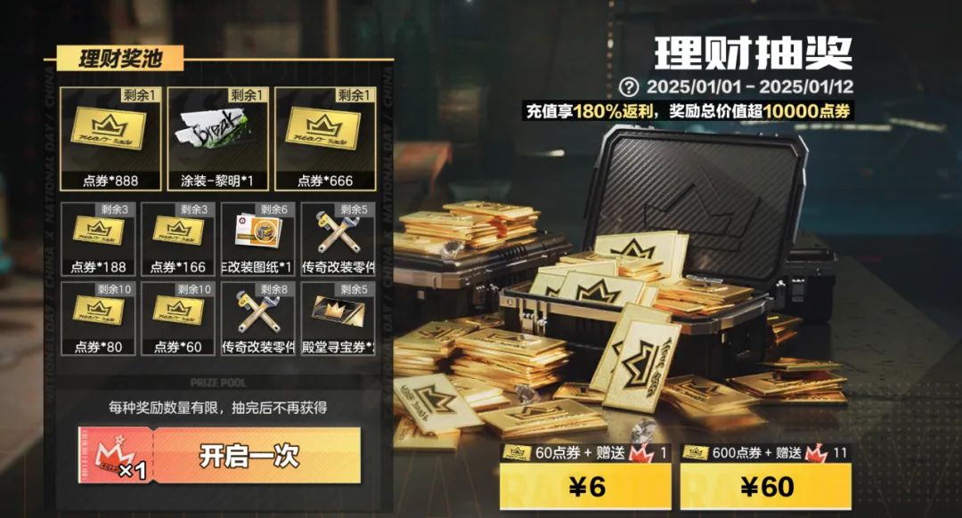 参与理财抽奖活动,直购可获得等价值点券,以及一定数量的超值理财奖券,还有全新【涂装】-「黎明」在奖池等待抽取。