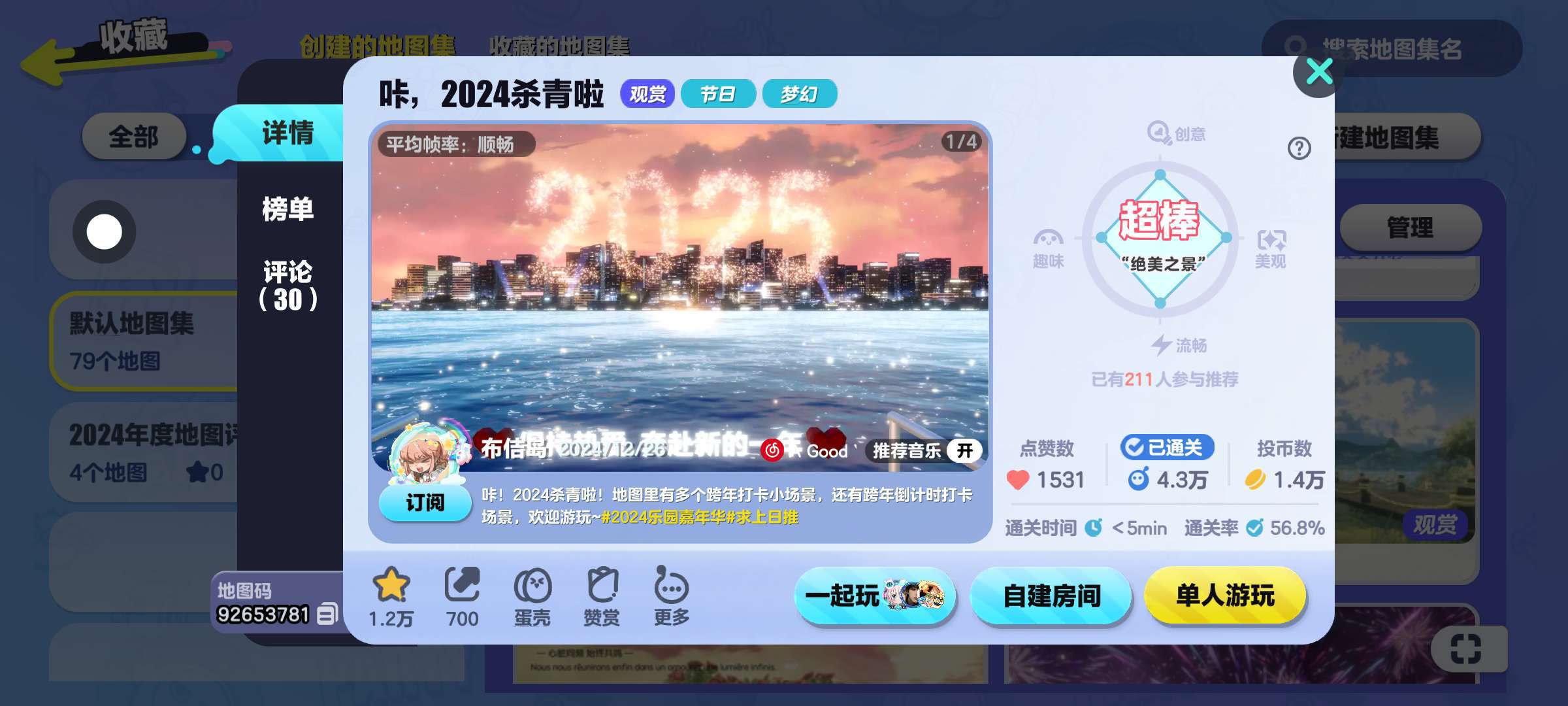 地图评价:地图起点中会有一段自动运镜~如果忘记录屏的话 可以在下一个场景的通关点旁边重新开始录屏哟🎉有没有感觉超级细心'◡'而且几乎每一个场景的烟花呀…都可以重复播放,方便录屏也可以多观赏几次(˵¯͒〰¯͒˵)很多打卡点还可以进入照片里边呢~地图超有趣味性哒,地图也很适合多人游玩呀,一排人坐在里边,看着多有氛围感呀'◡'
