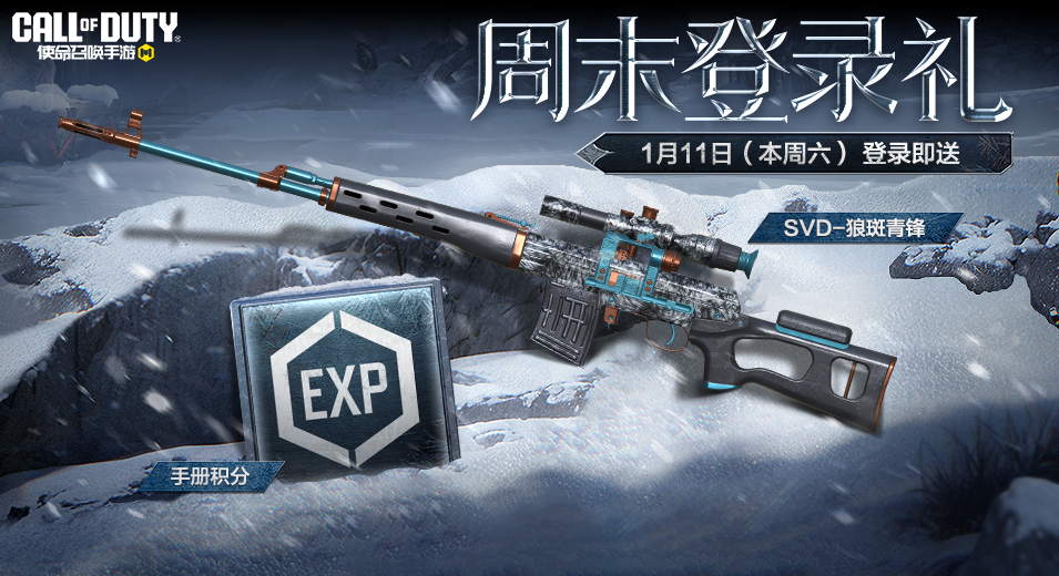 1月8日(明天),周末登录礼活动正式开启,战士们前往游戏参与预约,就能在1月11日(本周六)登录游戏时领取稀有级武器SVD-狼斑青锋和手册积分。