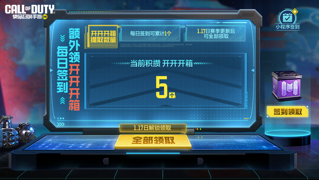 “使命召唤手游福利”小程序签到后与游戏内签到数据互通,不累加计算攒箱数;如果遇到小程序签到显示不同步的情况,重新进入游戏即可刷新数量哦~