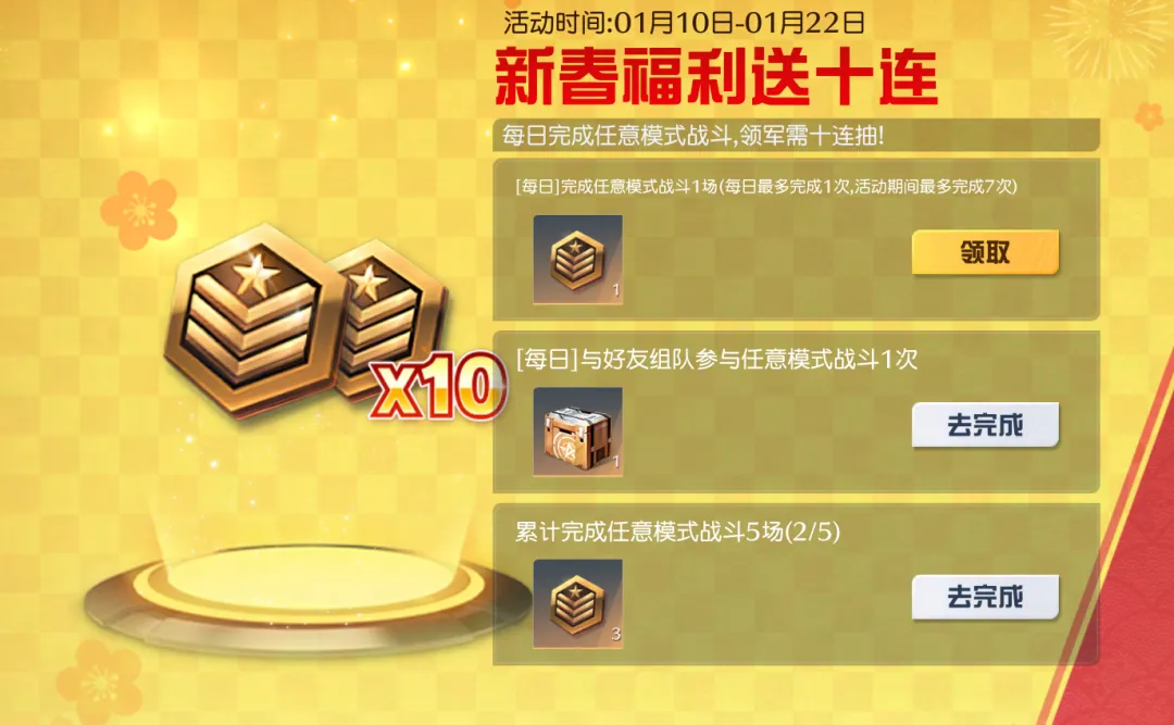 活动规则:每日完成任意模式战斗,最高可领军需10连抽!与好友参与任意模式战斗还可以获取芯片自选礼盒!