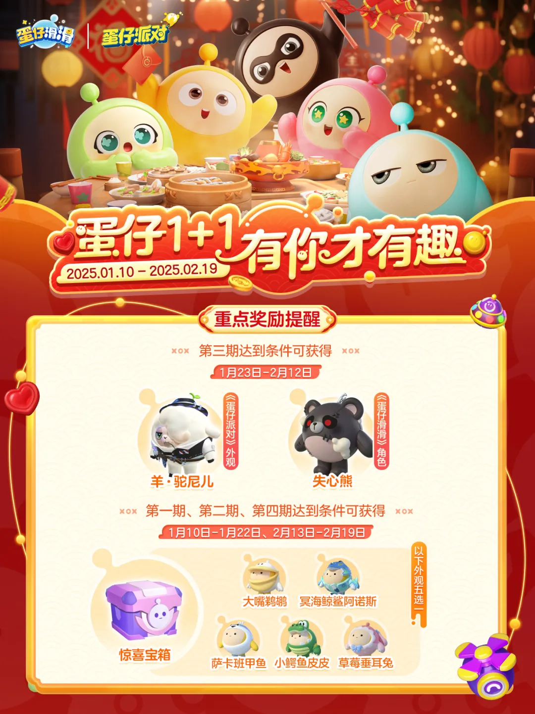 携手共庆,团圆迎春!蛋仔派对与蛋仔滑滑家庭齐聚,组队赢大奖,欢享春节盛宴!组队预热期已开启,快来抱团,精彩即将开启!