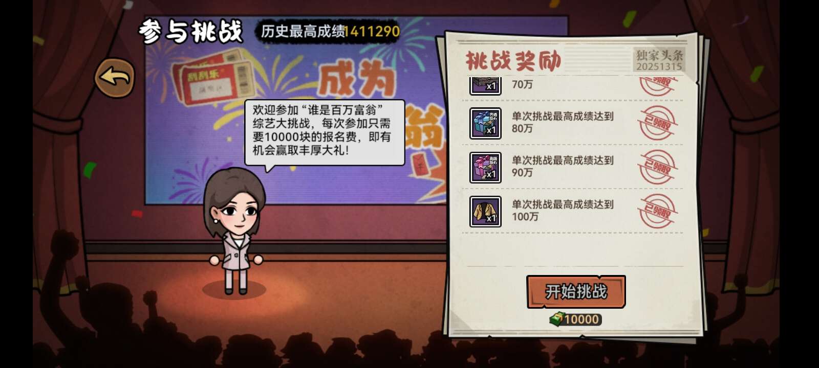 我最高就只能达到100万了。这个百万富翁的有点挑战。