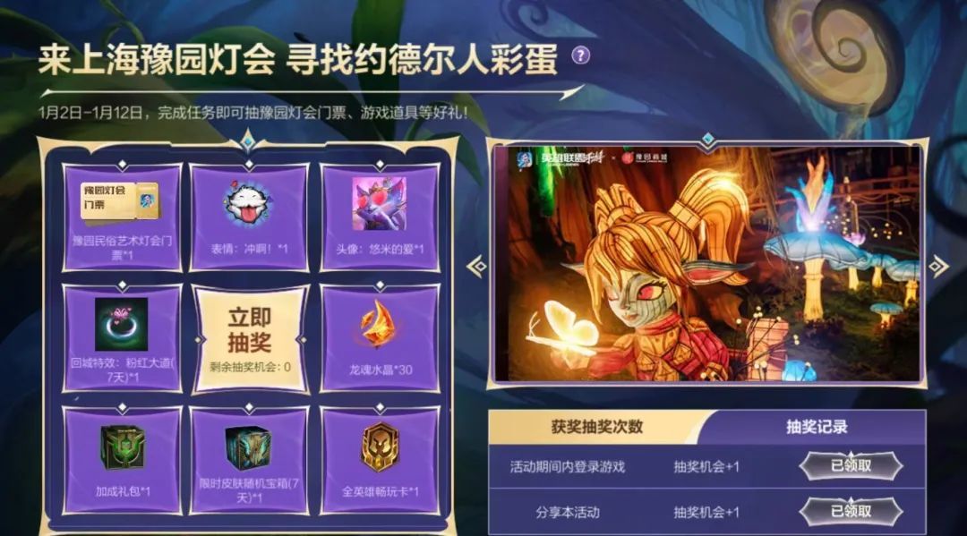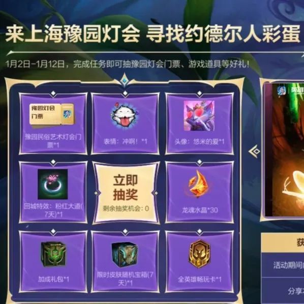 截止至1月12日,召唤师完成任务就有机会抽取豫园民俗艺术灯会门票、局内表情-冲啊!、头像-悠米的爱、限时皮肤随机宝箱(7天)等好礼~