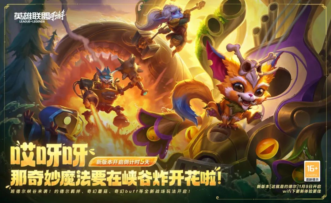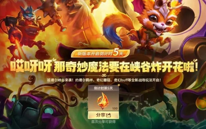 全新6.0版本“这就是约德尔!”开启倒计时5天~班德尔峡谷来袭,约德尔羁绊、奇幻蘑菇、奇幻buff等全新战场玩法开启~让魔法的火花在峡谷中四处绽放吧!
