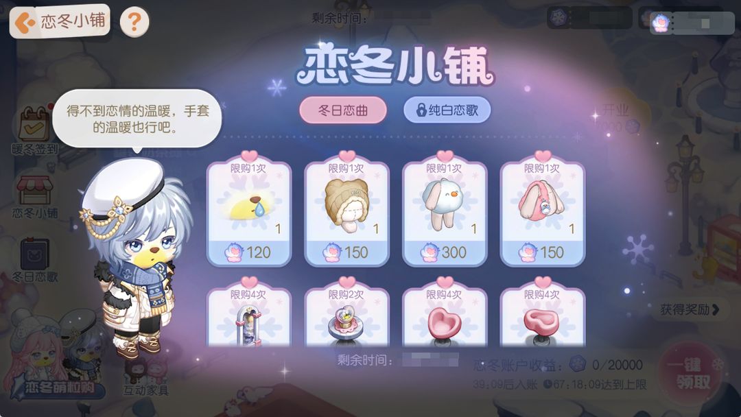 活动介绍:在温暖的恋冬小铺里,请脱下手套慢慢挑选喜欢的礼品吧!活动期间,活动商店开启,限时上新精美装扮,一起参与主题活动,收集活动代币「恋冬手套」,前来兑换礼物吧。