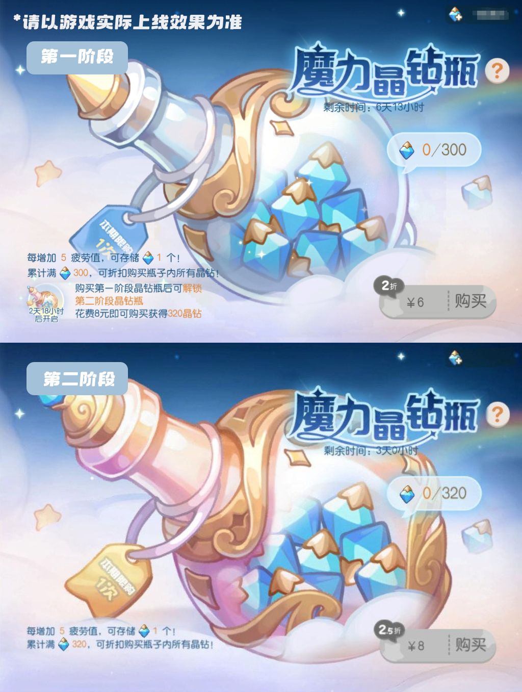 温馨提醒:各阶段晶钻瓶在活动期间内只能购买1次,魔力晶钻瓶存储的晶钻不会累积至下一期活动