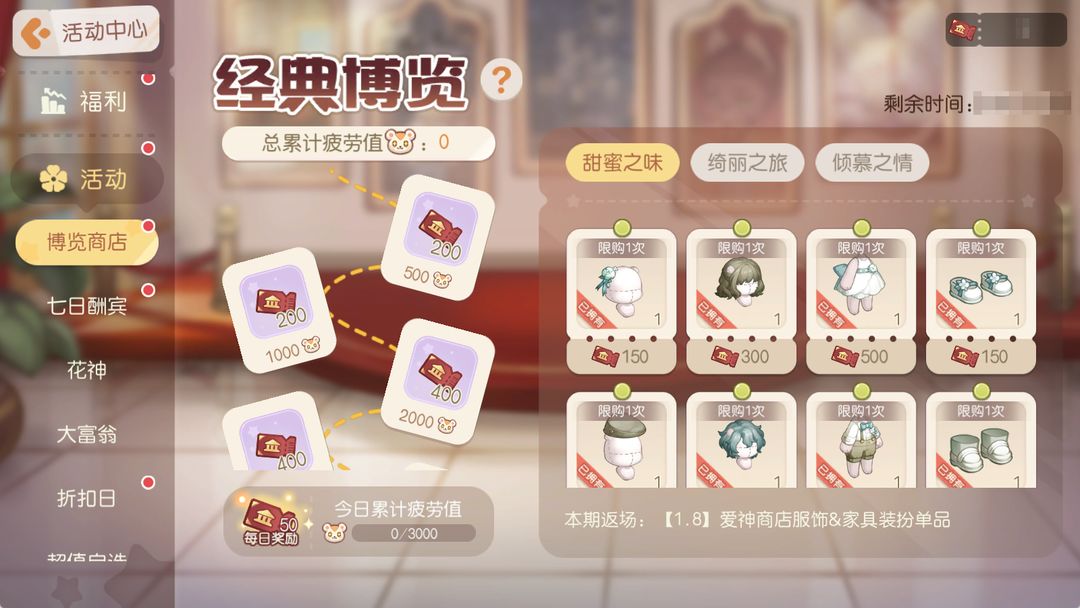 活动介绍:奥比们期待的兑换商店返场来啦!活动期间,小奥比们可通过劳作、采伐、挖矿、钓鱼等行为累积疲劳值获得「博览门票」,使用「博览门票」即可在「博览商店」中兑换往期主题商店的服饰、家具等物品。本期开启「爱神商店」服饰和家具的兑换,喜欢的小奥比们可不要错过哦!