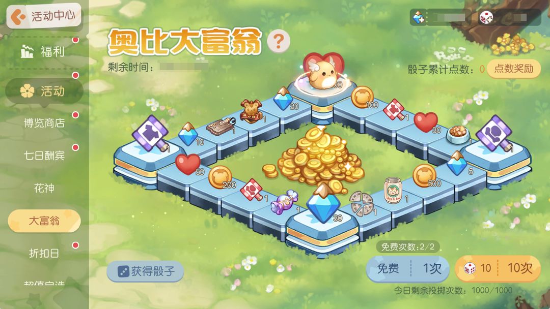 活动介绍:夺宝时间到!奥比大富翁活动限时开启,通过投掷骰子获得点数,小精灵会根据点数进行跳跃,前进到目的地格子将会获得对应奖励。