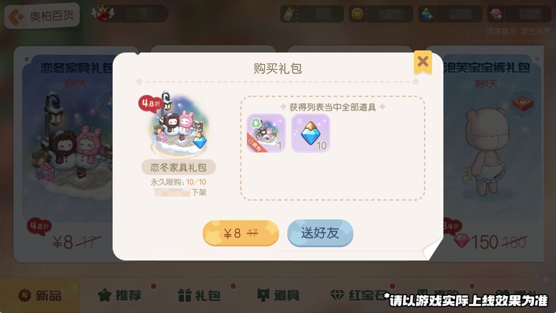 4.若「恋冬雪花球」数量不足,可使用晶钻进行购买;同时奥柏百货也会限时上架超值礼包。