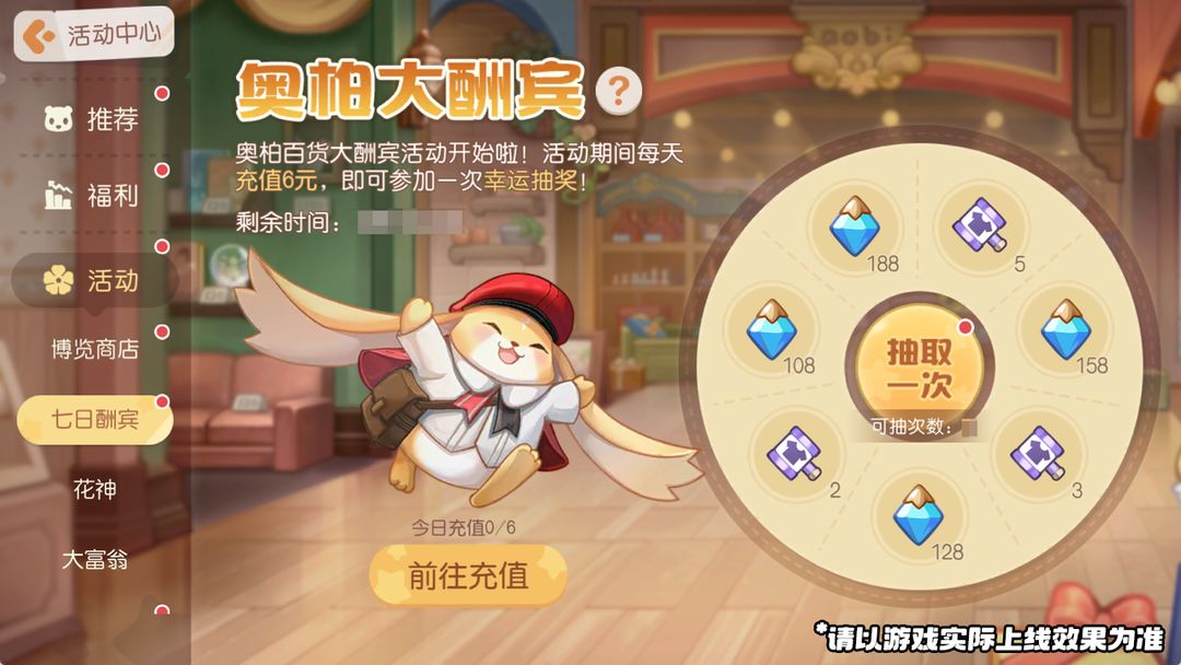 奥柏大酬宾火热开启!活动时间内,每日累计充值6元即可获得1次抽奖机会。连续7天每日累计充值6元,就可以把所有奖励都带回家哦!