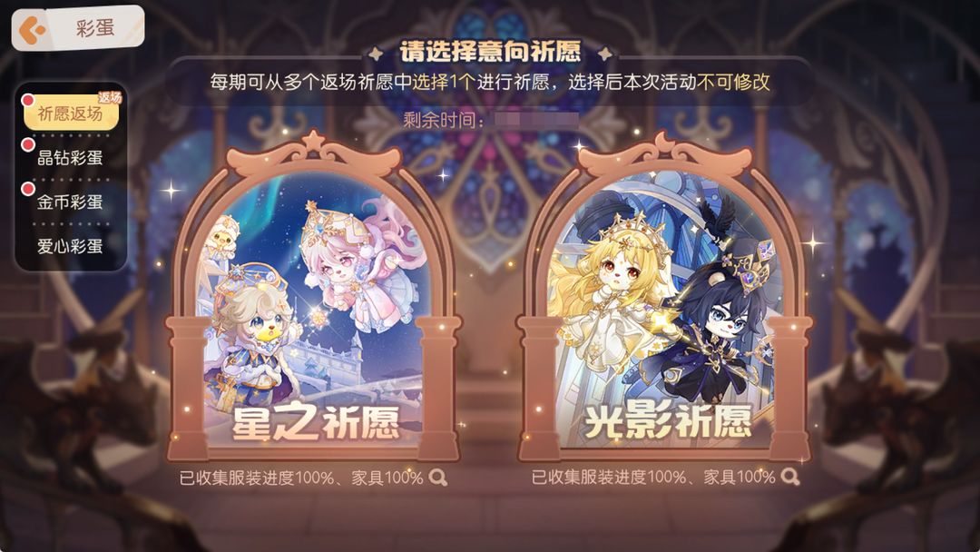 2.本次复刻彩蛋「星之祈愿」或「光影祈愿」将不继承首次开启时的抽取次数进度,即获得典藏的概率为70%,晨星概率为30%。抽取可获得对应积分,积分可在兑换商店内兑换物品,活动结束后剩余兑换积分折算成金币。