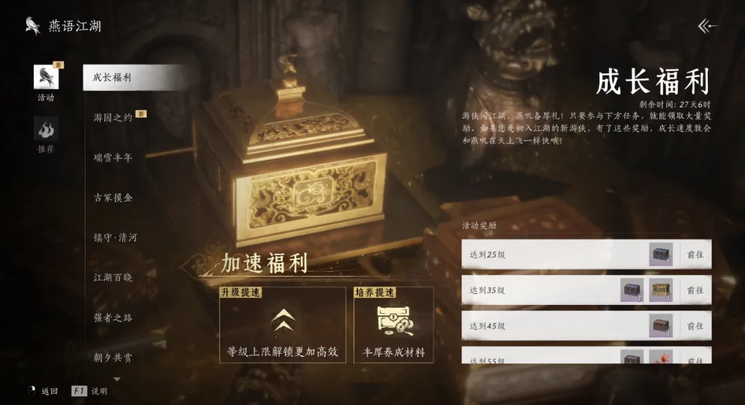 而或许还有很多初至燕云的新游侠还未到开封,但已经上线的“成长福利”活动,必须先为各位保驾护航!游侠们只需要达到相应的等级,就可以领取大量成长奖励,助力各位闯荡江湖。