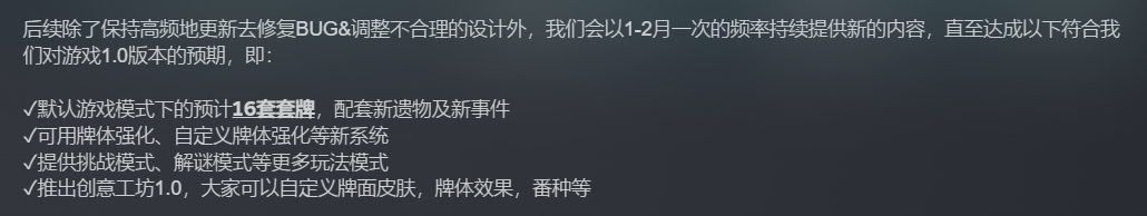 游戏将于1月20日上线Steam平台抢先体验,官方也发文表示:会以1-2月一次的频率持续提供新的内容,直至达成以下符合我们对游戏1.0版本的预期。