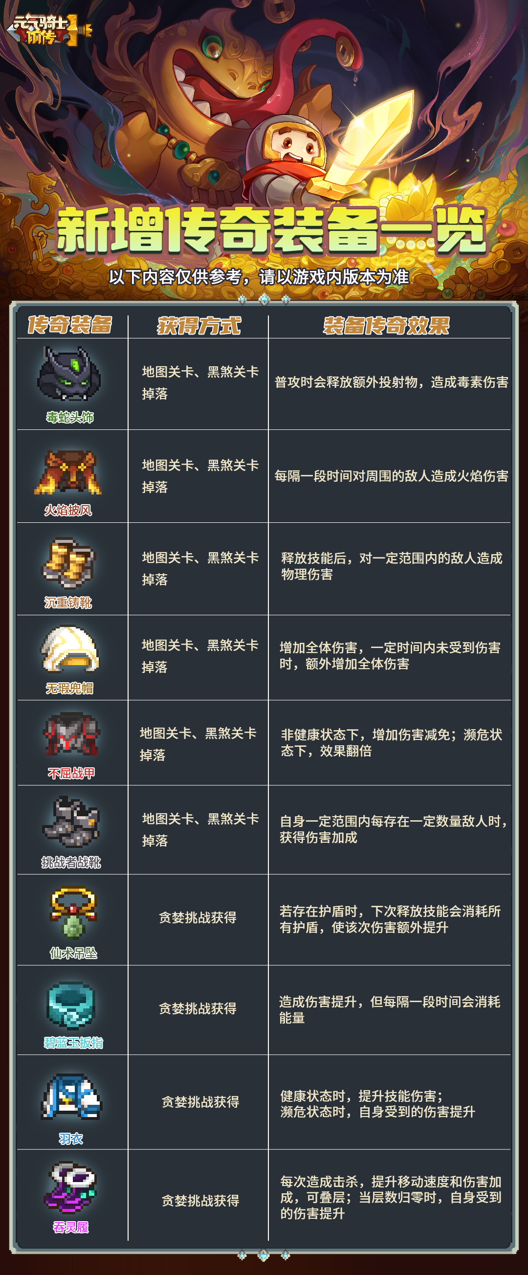 每开启20次任意类型的装备宝箱,则会获得1件必定带有3条橙色品质词缀的传奇装备(心愿单内装备也能获得),若小骑士没有提前选择好心愿单装备,则会在所有装备中随机抽取。