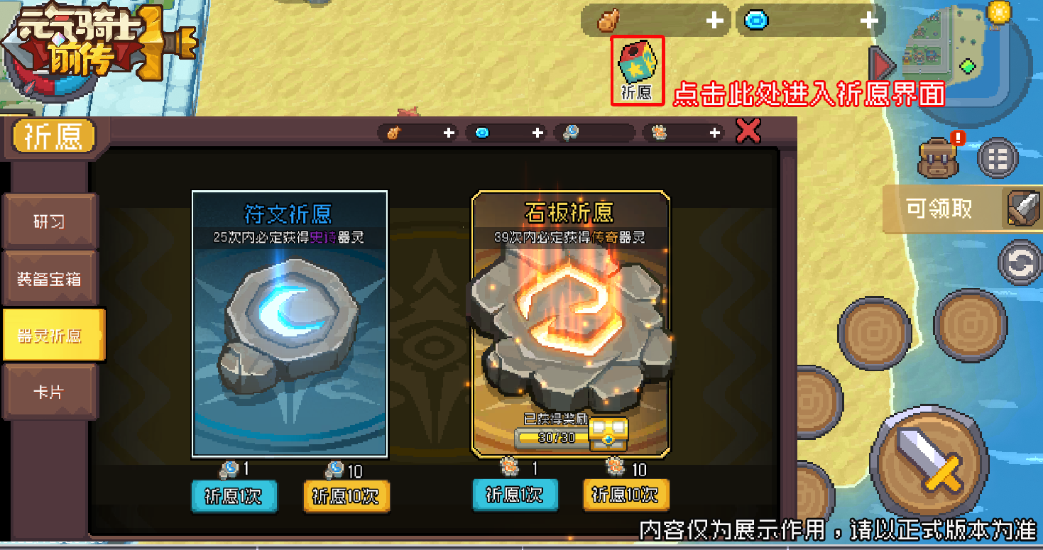 新赛季中的器灵祈愿、装备宝箱等玩法都将整合至“祈愿”中,小骑士可以点击游戏界面右上角的“祈愿”按钮进入。