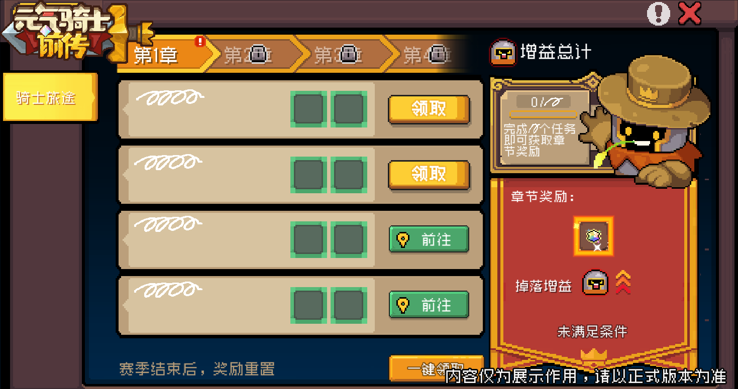 骑士旅途总共分为五个章节,每个章节下有对应任务,完成这些任务即可领取任务奖励。当小骑士完成当前章节下的所有章节任务,可领取章节奖励并解锁下一章节。
