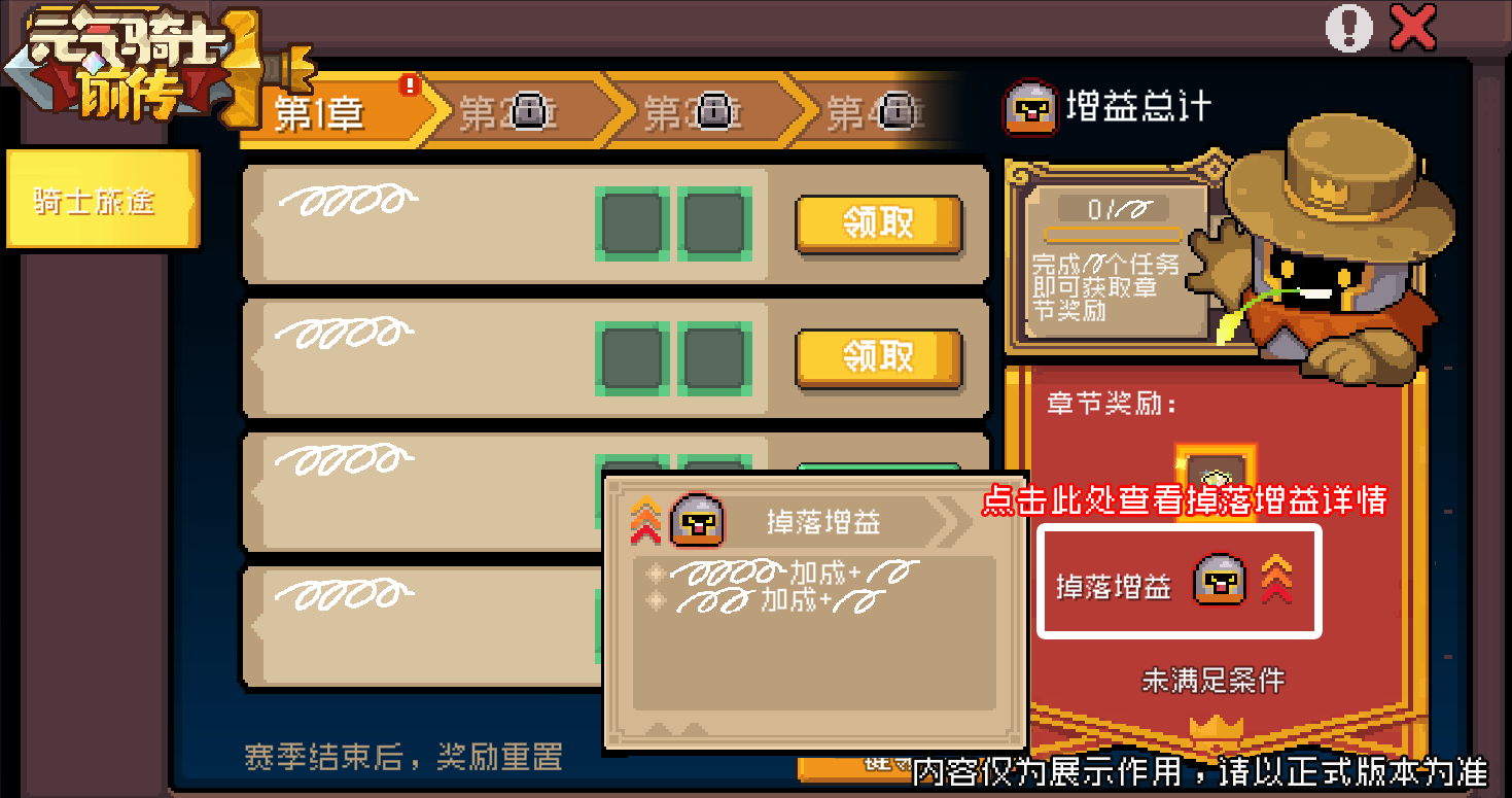 领取章节奖励可额外获得掉落增益,掉落增益仅在SS1赛季中对纯净赛季角色生效,SS1赛季结束后掉落增益将消失。若小骑士未完成指定数量的当前章节任务,则会在右下角显示“未满足条件”,无法触发掉落增益。