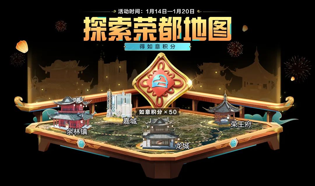 1月14日-1月20日,完成新地图-荣都的探索任务,邀请好友参与嘉城合伙经营,就能领取如意积分!
