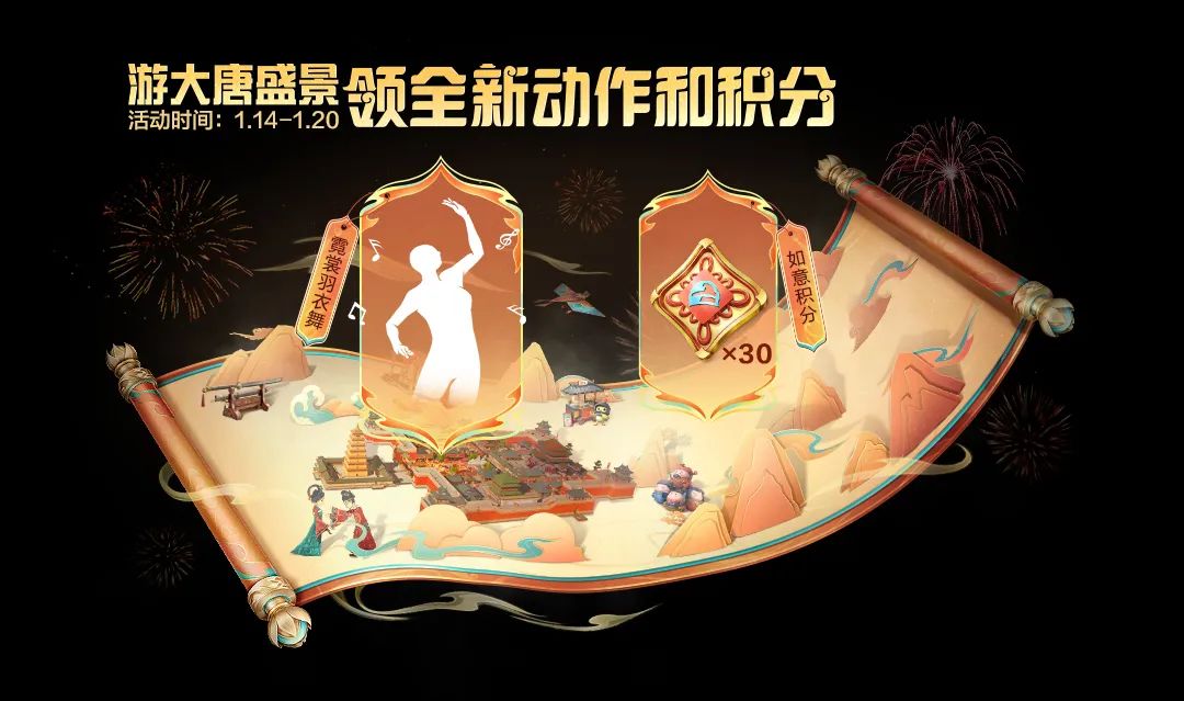 1月14日-1月20日,参与任务领取“令牌“,游览参观大唐西安城的钟鼓楼挑战、主题道具、皮影玩法、唐俑叠叠乐、小吃摊等累计如意积分,助力兑换全新巳巳如意头盔,游览华清宫还送全新动作-霓裳羽衣舞~