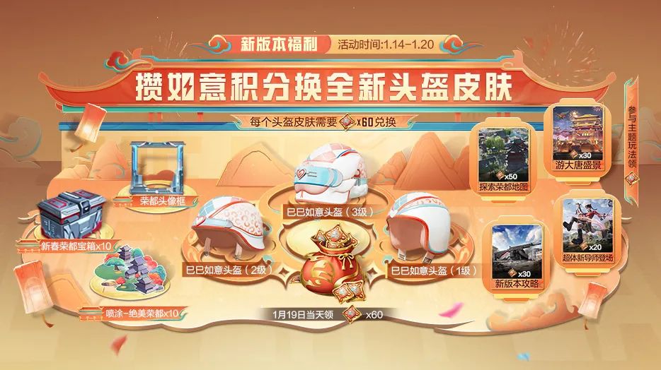 1月14日-1月20日,完成每日任务(每天最多领20如意积分)以及参与探索荣都地图、游大唐盛景、新版本攻略、超体新导师登场等4个活动获得130如意积分,可兑换全套头盔皮肤、荣都头像框、新春荣都宝箱、绝美荣都喷涂等福利。