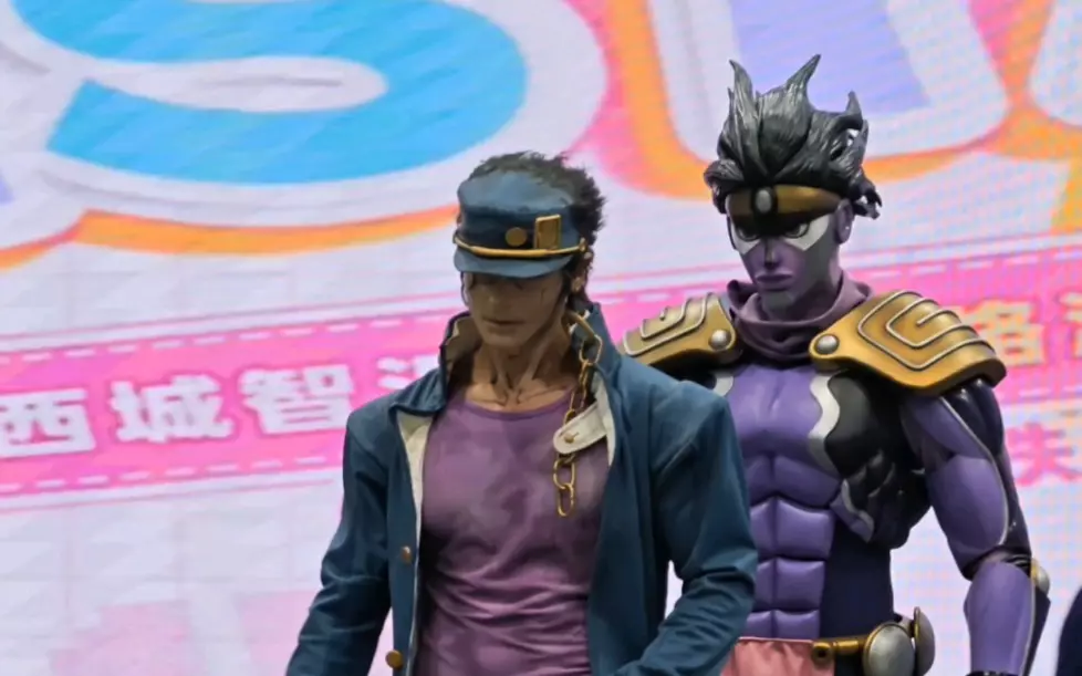 漫展上的《JOJO的奇妙冒险》cosplay还原度拉满,coser还原空条承太郎与白金之星的经典互动姿势,造型细节到位,充满二次元特色。