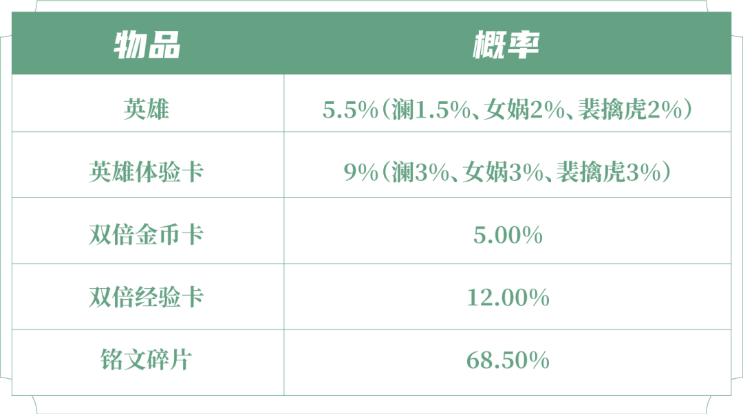 打开后可随机获得以下奖励之一:澜、女娲、裴擒虎、英雄体验卡3天、双倍金币卡:1日、双倍经验卡:1日、188/138/108铭文碎片。
