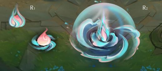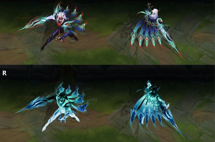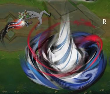 首次施放R(4)技能时,泰隆向四周掷出旋转的蓝红色油彩刀刃,同时身体进入蓝青色半透明状态并散发青色辉光,此时还将伴有涌动的蓝红油彩全屏特效。