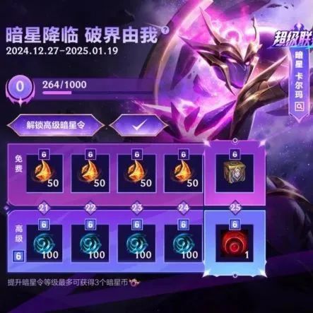 奖励:新皮肤暗星 卡尔玛,皮肤边框-暗星 卡尔玛,局内表情-萌化大师,龙魂水晶等奖励