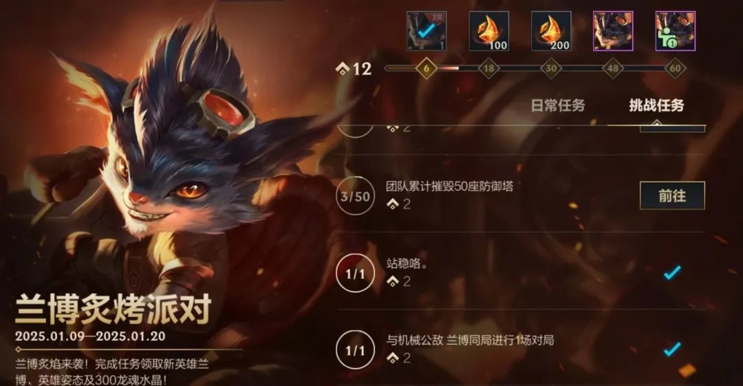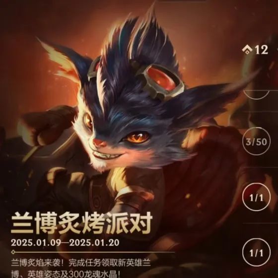 兰博炙焰来袭!截止至1月20日,召唤师完成任务即可获得新英雄机械公敌 兰博、姿态-出发、龙魂水晶*300好礼。