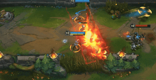 对线期,TheShy一般会选择提前积攒40热量,随后寻找机会在敌人技能真空期上前对拼。首先,施放E(3)技能:电击鱼叉打出减速,在进入【危险温度】状态后开启喷火器灼烧敌人。