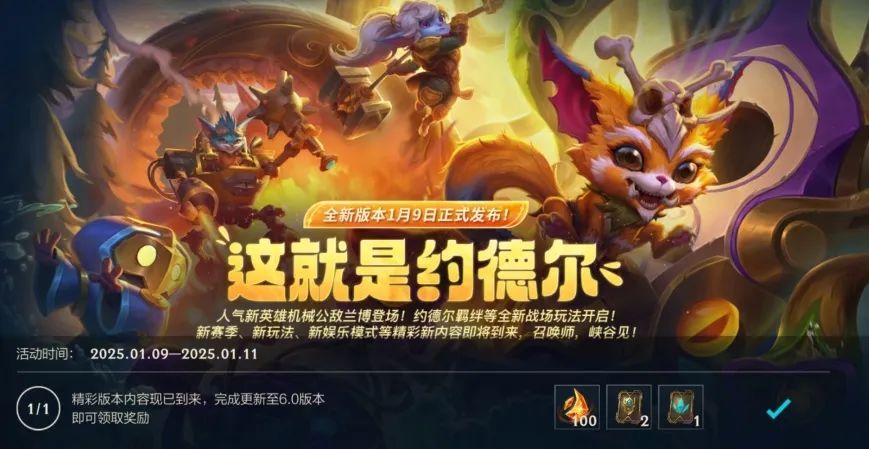 6.0版本“这就是约德尔!”已焕新登场,奇幻魔法带来别样体验~截止至1月11日(今日),召唤师将游戏更新至6.0版本即可领取团队胜利加成卡*2、3胜双倍晶石卡*1和龙魂水晶*100好礼。