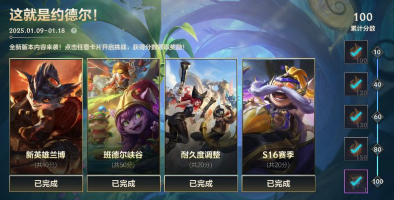 6.0新版本“这就是约德尔!”火热畅玩中!截止至1月18日,召唤师点击任意卡片开启挑战,获得一定分数即可领取精选个性化道具随机宝箱、龙魂水晶*500奖励~