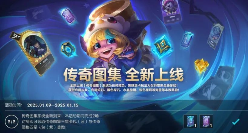 “传奇图集 全新上线”活动仅剩最后1天!截止至1月15日(今日),召唤师完成2场对局即可获得传奇图集三星卡包(蓝)以及传奇图集四星卡包(紫)奖励。