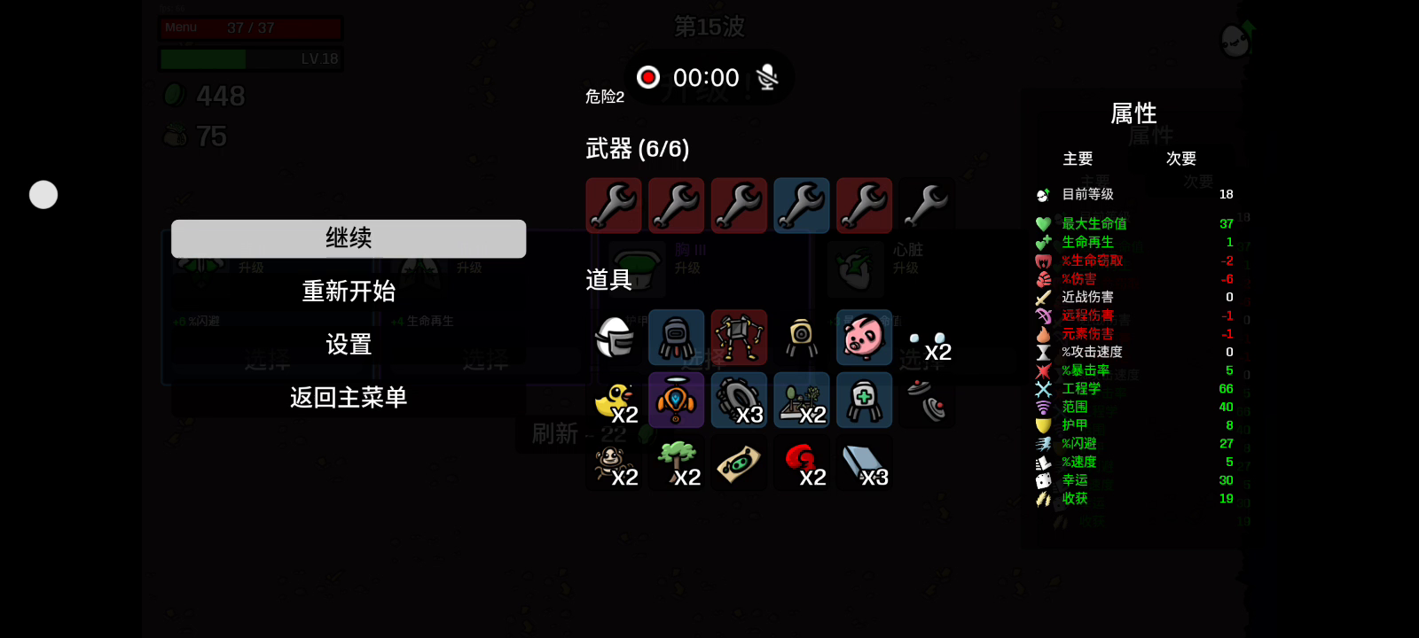 提示:左侧options-General-English 可更改语言 未提示给予存储权限请手动给予避免存档清零 一款自上而下的竞技场射击 Roguelite 游戏,您可以扮演土豆,一次最多使用 6 种武器,与成群的外星人作战。从各种特征和物品中进行选择,以创建独特的构建,并在帮助到来之前生存。 的幸存者:Brotato,能够同时处理 6 种武器的马铃薯。为了等待同伴的救援,布罗塔托必须在这个充满敌意的环境中生存。 特点 默认情况下自动发射武器,并提供手动瞄准选项 快速运行(不到 30 分钟) 数十个角色可用于自定义您的奔跑(单手,疯狂,幸运,法师等等) 数百种物品和武器可供选择(火焰喷射器、SMG、火箭发射器或棍棒和石头) 在每波持续 20 到 90 秒的波浪中生存,并在此期间杀死尽可能多的外星人 收集材料以获取经验,并在敌人一波波敌人之间从商店获取物品 辅助功能选项:调整敌人的生命值、伤害和速度,让难度适合你