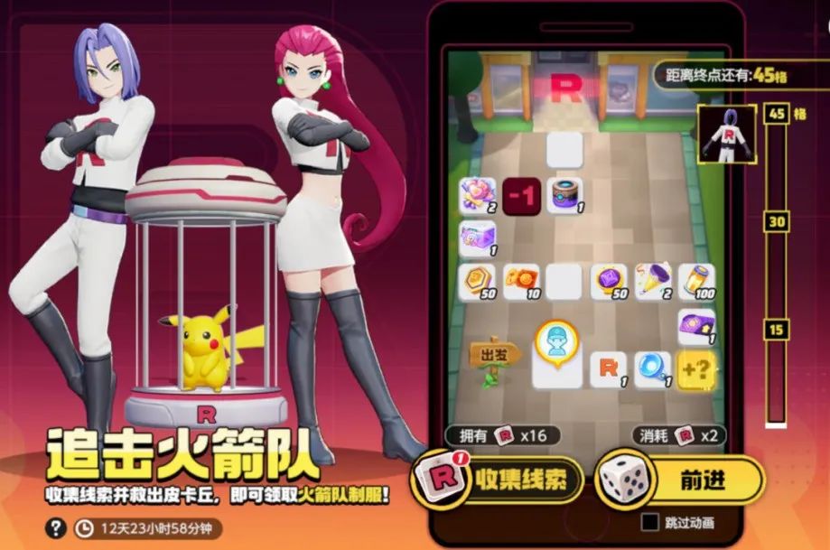 消耗线索获得前进点数向前追击,追击路上训练家共会遇到三个不同关卡的小游戏挑战,通关后解锁新的地图才能继续前进,到达终点后救出皮卡丘,可领取联动时装-火箭队制服!