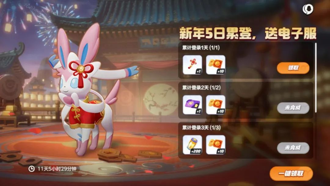 新年有礼,见面即欣喜!1月28日起,训练家每日登录游戏均可领登录礼,累计登录5日可免费获得新春风格仙子伊布电子服,登录首日即可获得贴纸(新春挂饰)哦~