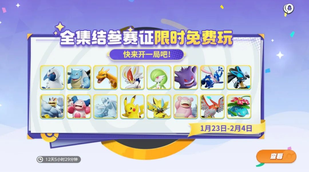新春就要一起嗨!1月23日-2月4日,新春福利众多宝可梦参赛证限时免费体验!0门槛体验和更多宝可梦并肩作战,阵容更自由,速速约上好友畅快“上分”吧~