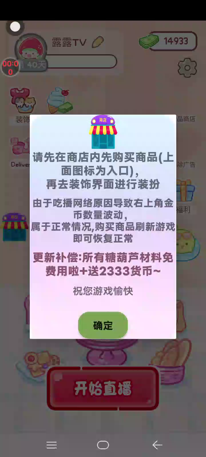 更新新的装饰和圣诞糖葫芦!! 「你进行草莓糖葫芦吃播的话,我就赞助100元。」 「脆口的声音太迷人了(°θ°)」 由于客人都被最近新开的许多糖葫芦店家抢走,曾经号称糖葫芦达人的父母因此卧病在床。 继承父母店面的主角露露开始糖葫芦吃播来宣传店面。 直到成为真正的糖葫芦达人那一天! 「今天我也要开始糖葫芦直播罗!( •o• )」 [串材料] 只有新鲜的水果的话,很难以一名吃播实况主存活下来。还要有松饼、地球软糖、青阳辣椒!利用奇特的材料制作糖葫芦吧。 [裹糖衣] 将材料串满竹签的话,就放进锅子搅动吧。唯有利用达人的秘法,才能裹出又薄又脆的糖衣。 [即时吃播] 咔哒咔哒!今天的吃播也大成功。热烈的聊天内容看起来反应也不错。看来得利用完成观众任务得到的赞助金来买新材料了! 来,准备好了吧?现在就马上挑战成为糖葫芦达人吧!