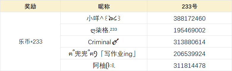 随机抽取5名玩家,每人发放233乐币!