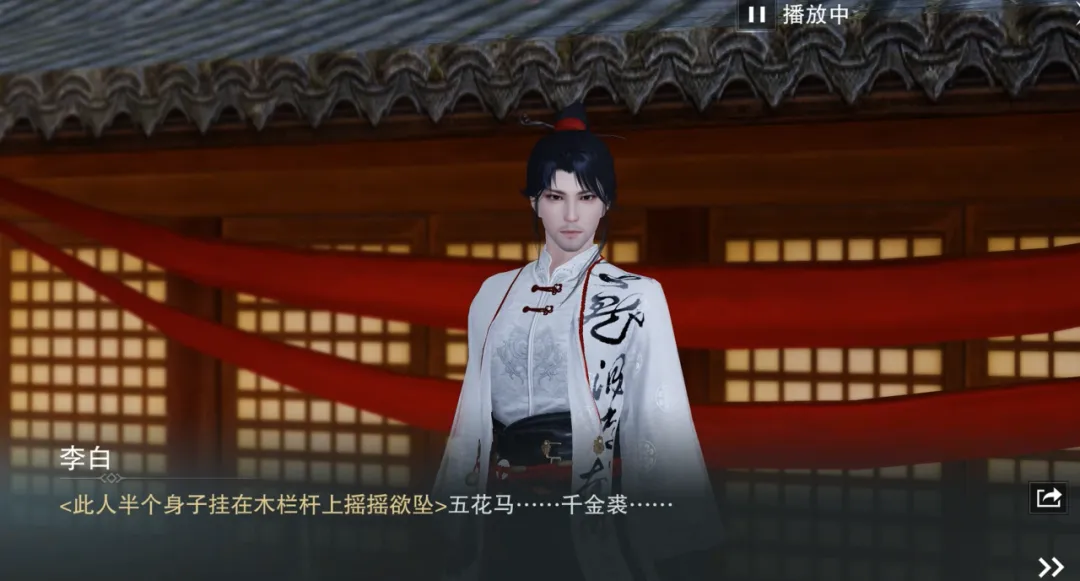 大唐盛世,诗酒风流。一位白衣人正醉醺醺地倚在栏杆上,人都快站不稳了,还不忘念叨着什么“五花马、千金裘”,少侠要是路过,记得上前帮个忙,别让李白的脑袋着地了!