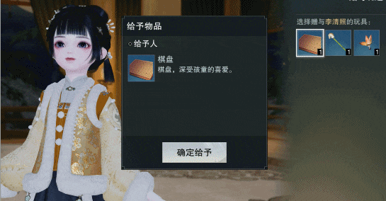 年幼的李清照对来自江湖、充满新奇故事的少侠很感兴趣,少侠若是送上精心准备的玩具,定能赢得小姑娘的喜爱!不同的玩具会引发她别样的想象,也许这位未来才女的创作灵感也有部分来自少侠哦~