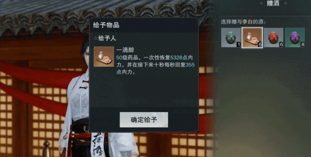 他身着白衣,手持酒壶,脚步踉跄却又潇洒自如,少侠可以赠他美酒,与他拉近关系哦!赠送不同的酒,李白会作出不同的诗,一起看看豪放不羁的诗仙是怎样出口成章的吧!