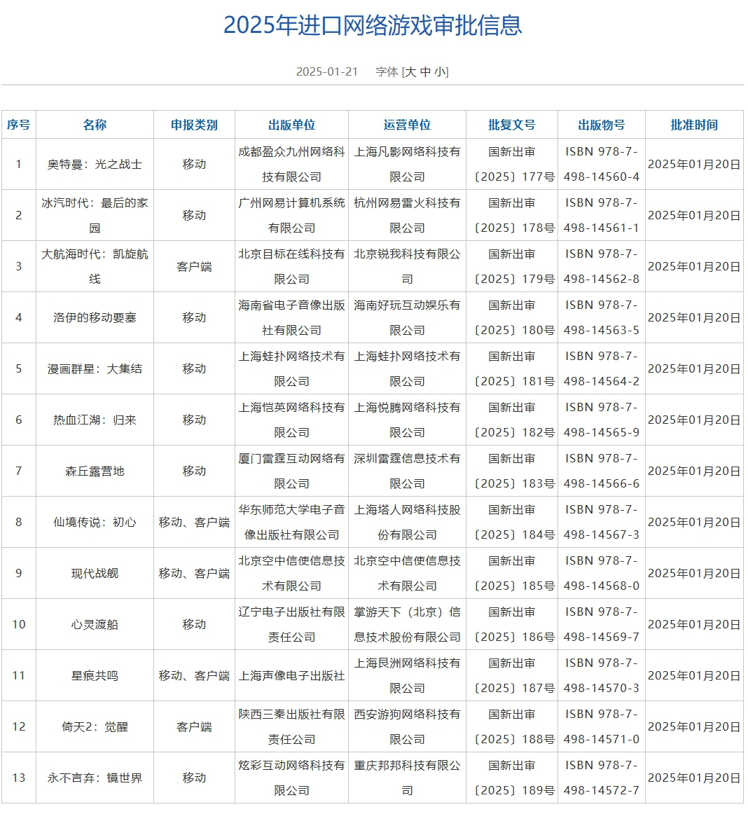 233乐园1月21日最新消息!最新一批国产、进口游戏版号已正式发布!本次审批版号共有123款国产游戏加13款进口游戏共计136款游戏过审,其中值得重点关注游戏有《王者荣耀世界》《伍六七:暗影交锋》《星痕共鸣》《现代战舰》等。
