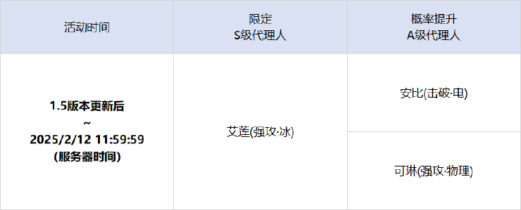 活动期间,限定S级代理人[艾莲(强攻 ? 冰)]以及A级代理人[安比(击破 ? 电)]、[可琳(强攻 ? 物理)]的调频获取概率将大幅提升!