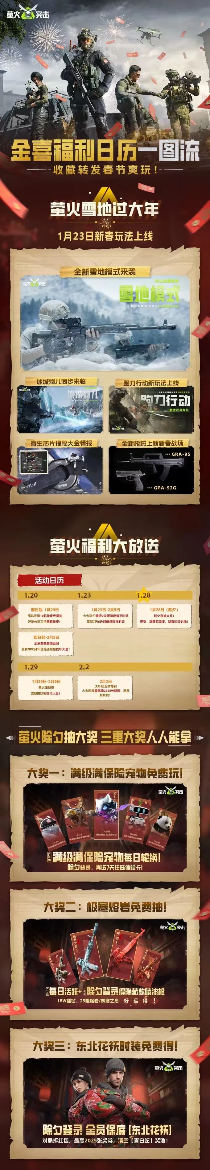 喜迎新春,冲刺春节,萤火新春金喜福利放送中,↓收好下面这份萤火春节日历长图,新春玩法、福利活动一目了然,春节跟紧日历不掉队,所有奖励一图通关!