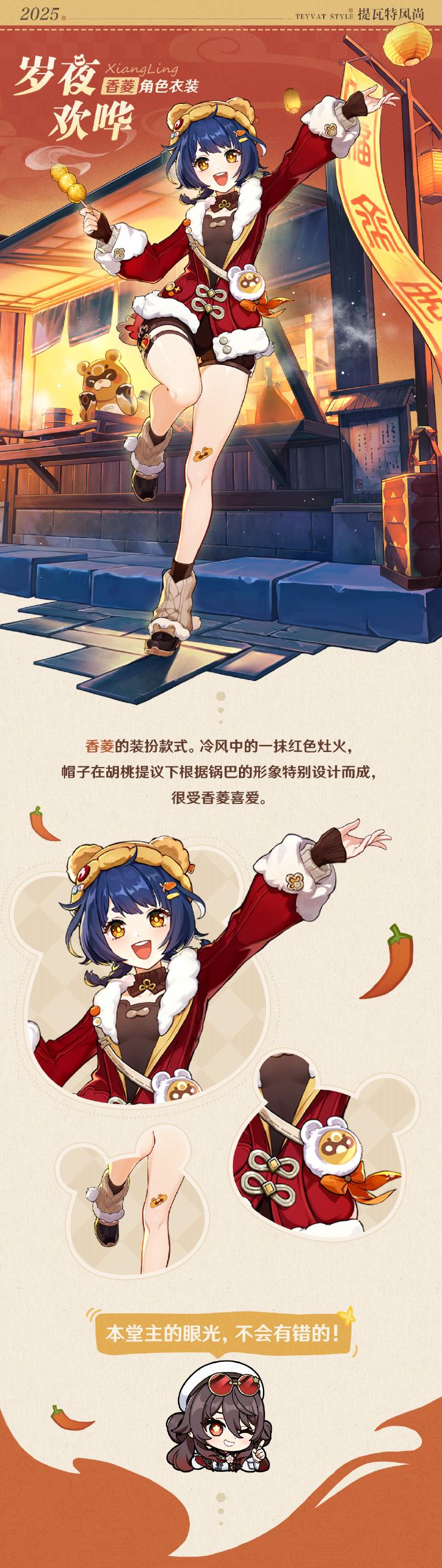 香菱全新衣装——「岁夜欢哗」将在5.3版本中上线,旅行者可通过限时活动「春曦画桃符」免费获得该衣装,一起来看看吧~