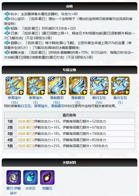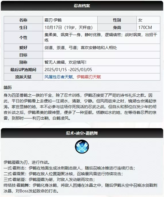 本文是忍者档案之霜刃·伊鹤的介绍,她是风属性女忍者,兼具柔美与飒爽,有星夜神谕等多款皮肤。档案包含其生日、个性等基础信息,还介绍了她的流派天赋、忍术、援护技、命格、专属宝物等战斗相关内容,其最后UP池在2025/01/15-2025/03/05。